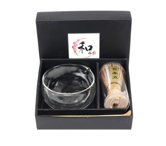 Matcha Glass Matcha Latte Bowl with Whisk and Scoop.