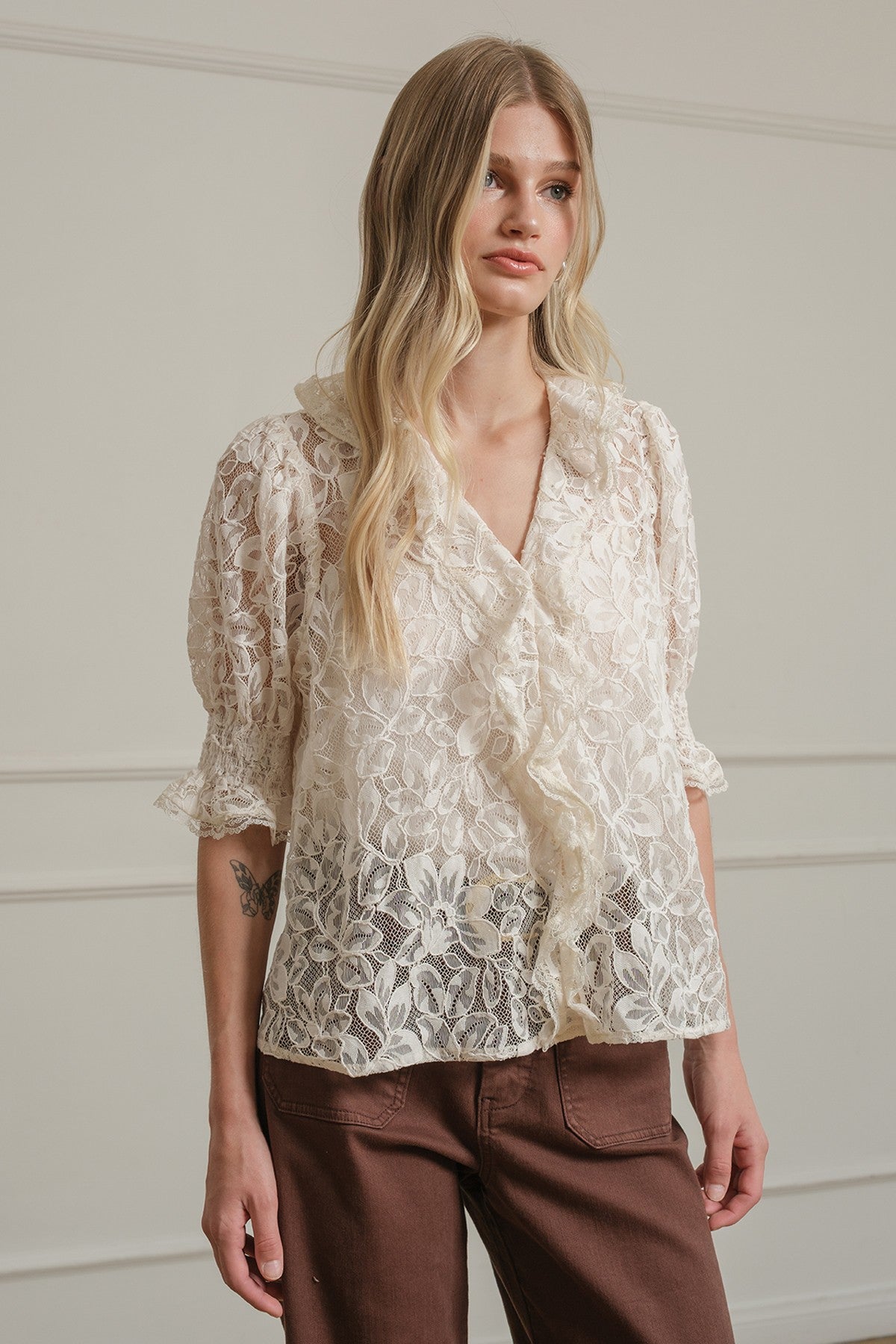 Romantic blouse crafted from a 48% Cotton / 52% Nylon blend for a soft yet structured lace finish. Features an all-over floral lace design with a delicate ruffle-trim front. Designed with puff half sleeves and smocked cuffs for added volume and femininity. Lightweight and semi-sheer, perfect for layering with camisoles or bralettes. An elegant piece that elevates any look - pair with denim for a casual chic vibe or style with skirts for a dressier occasion. -Material: Lace with detachable slip cami -Details: Ruffle trim, puff sleeves, scallop edges -Fit: True to size, relaxed silhouette Fabric Contents SELF: 48%COTTON 52%NYLON LINING: 100%wPOLYESTER