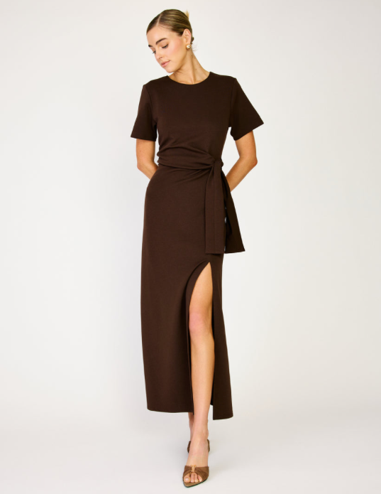 - Mid-weight stretch woven fabric - Round neckline - Short sleeves - Knot detail - Side slit - Hook-and-eye and hidden zip at center back - Lined