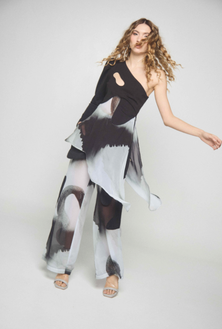 This design features a double-layered structure: a high-waisted inner short with sculpted wavy shapes that define the body, and a sheer printed outer pant that floats and moves with each step. The result is a visually striking silhouette that feels elevated, light and sophisticated.