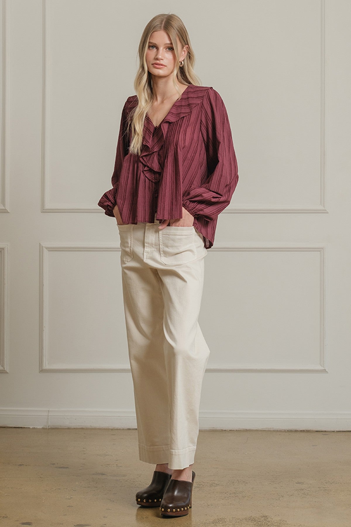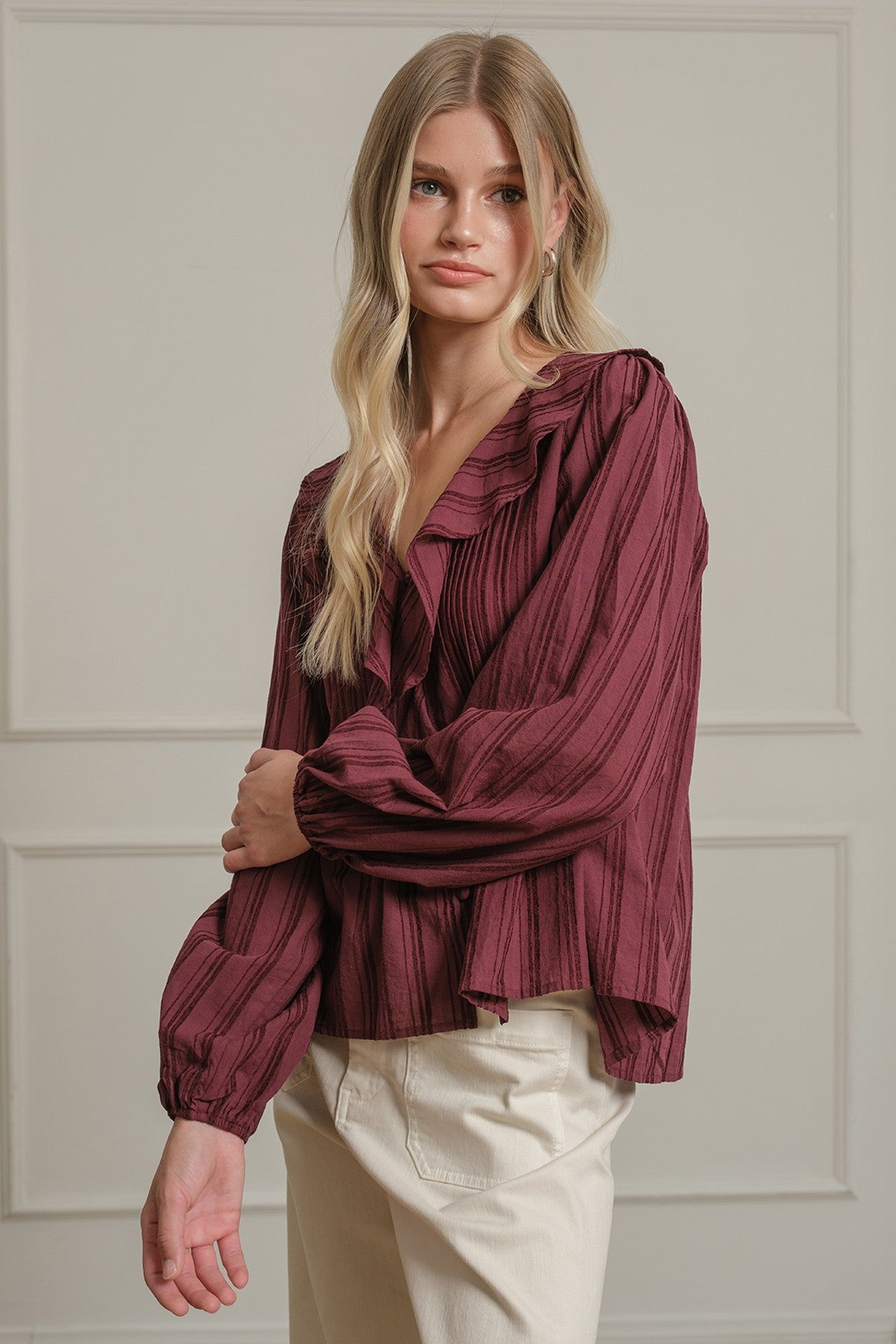 Elegant blouse crafted in a soft 80% Cotton / 20% Rayon blend for a breathable yet refined feel. Features a ruffle-trim collar and front button-down design that add feminine detail. Designed with balloon sleeves and gathered back yoke for volume and flowy movement. Fabric Contents: 80%cotton20%rayon