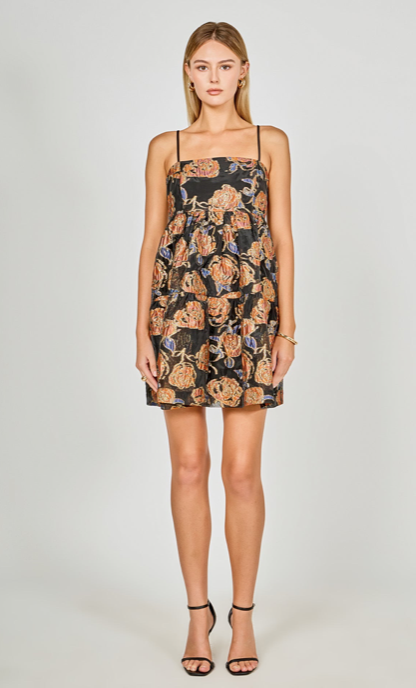Introducing our Metallic Jacquard Mini Dress. Featuring shimmering jacquard fabric and a figure-flattering silhouette, this mini dress combines sophistication with bold style. The metallic sheen and form-fitting design make it perfect for cocktails, parties, or date nights. Shine effortlessly and stand out in this must-have statement piece. Mini dress Metallic black jacquard fabric Side seam invisible zipper Adjustable strap Shirring seam Hand wash cold Do not bleach Do not tumble dry Iron low Self: 100% Polyester Combo: 95$ Polyester 5% Spandex Lining: 100% Polyester
