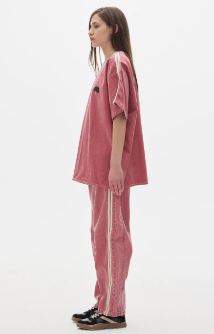 T-shirt de denim oversized, mangas caídas. Cuello a contratono y bordados en el frente. 100% algodón