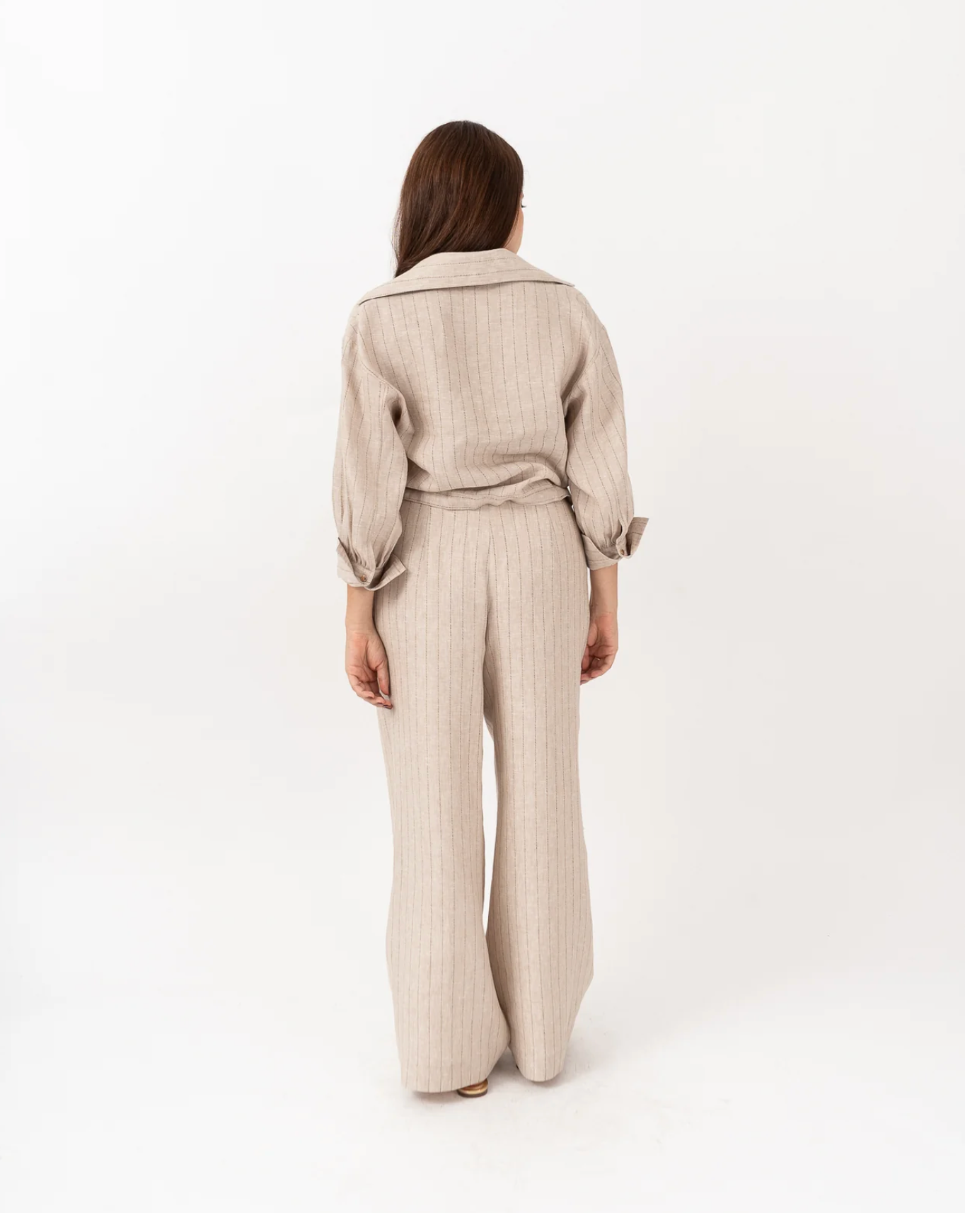 Long kimona-sleeved shirt-collar blouse with gathered and functional cuffs, chest pocket, hem sash with a strap for sdjusting the tie.