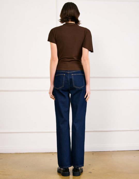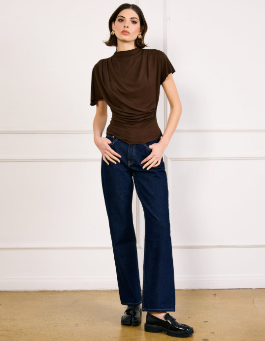 - Mid-weight knit jersey fabric - Drape detail - Mock neck - Short sleeves