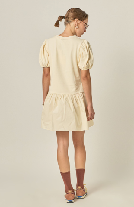The perfect style to put on when you don't have time to put together an outfit but you want to feel and look good. Our Mixed Media Mini Dress is extremely versatile and can be styled throughout the seasons. Its breathability will keep you cool during the warmer months and during fall and winter you can pair it with your favorite tights and long coat. Although this dress is simple details like the puffy sleeves and uneven front hem set this mini dress apart from others. Mixed media fabrication (knit bodice cotton skirt) Puffy short sleeves Front uneven seam detail Round neckline Mini length Hand wash cold Do not bleach Do not tumble dry Iron low Shell: 60% Polyester 35% Cotton 5% Spandex Contrast1: 100% Cotton Contrast2: 60% Polyester 35% Cotton 5% Spandex
