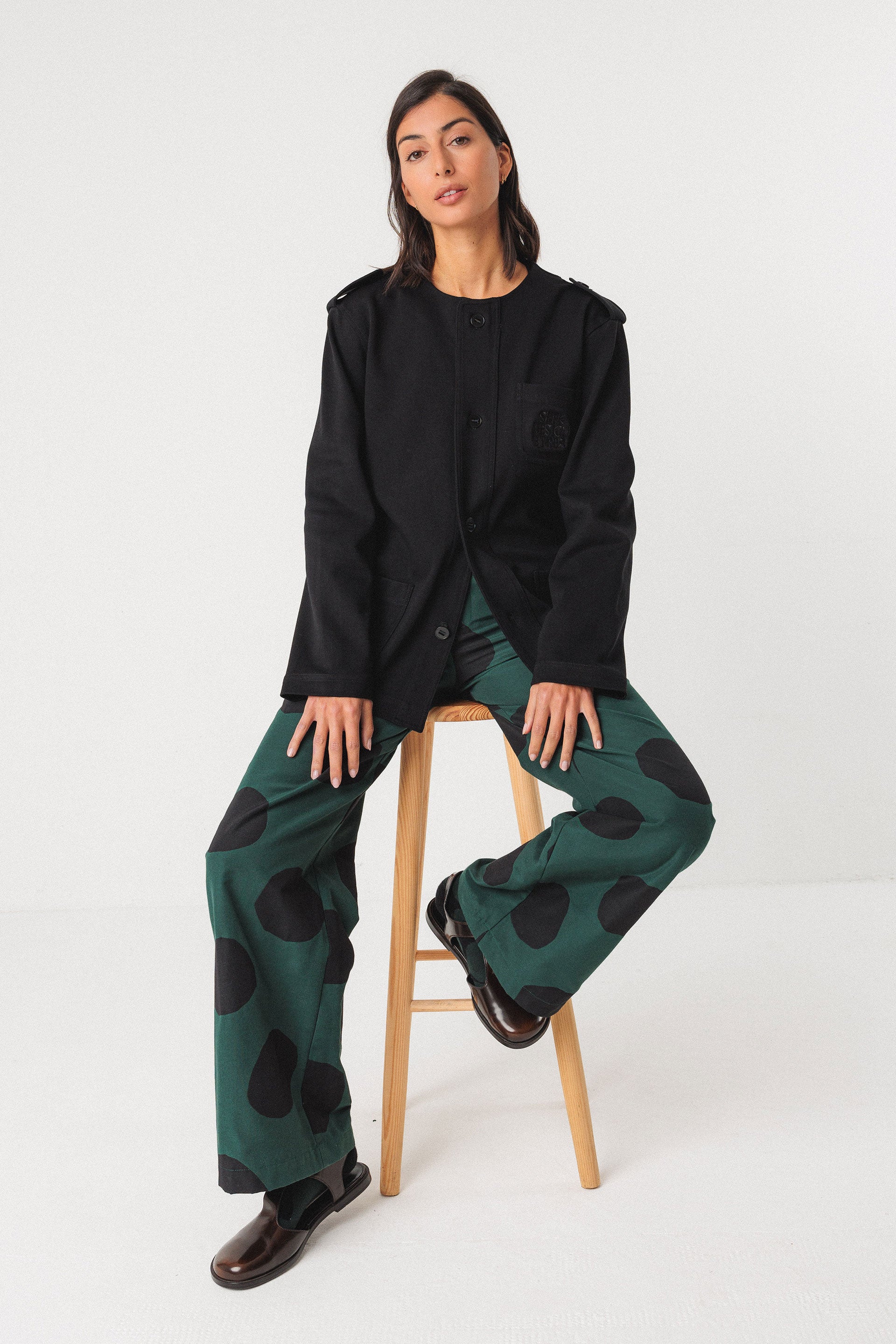 Straight leg trousers in a jacquard patterned fabric. They have slant pockets and a zip fly at the front and faux welt pockets at the back.